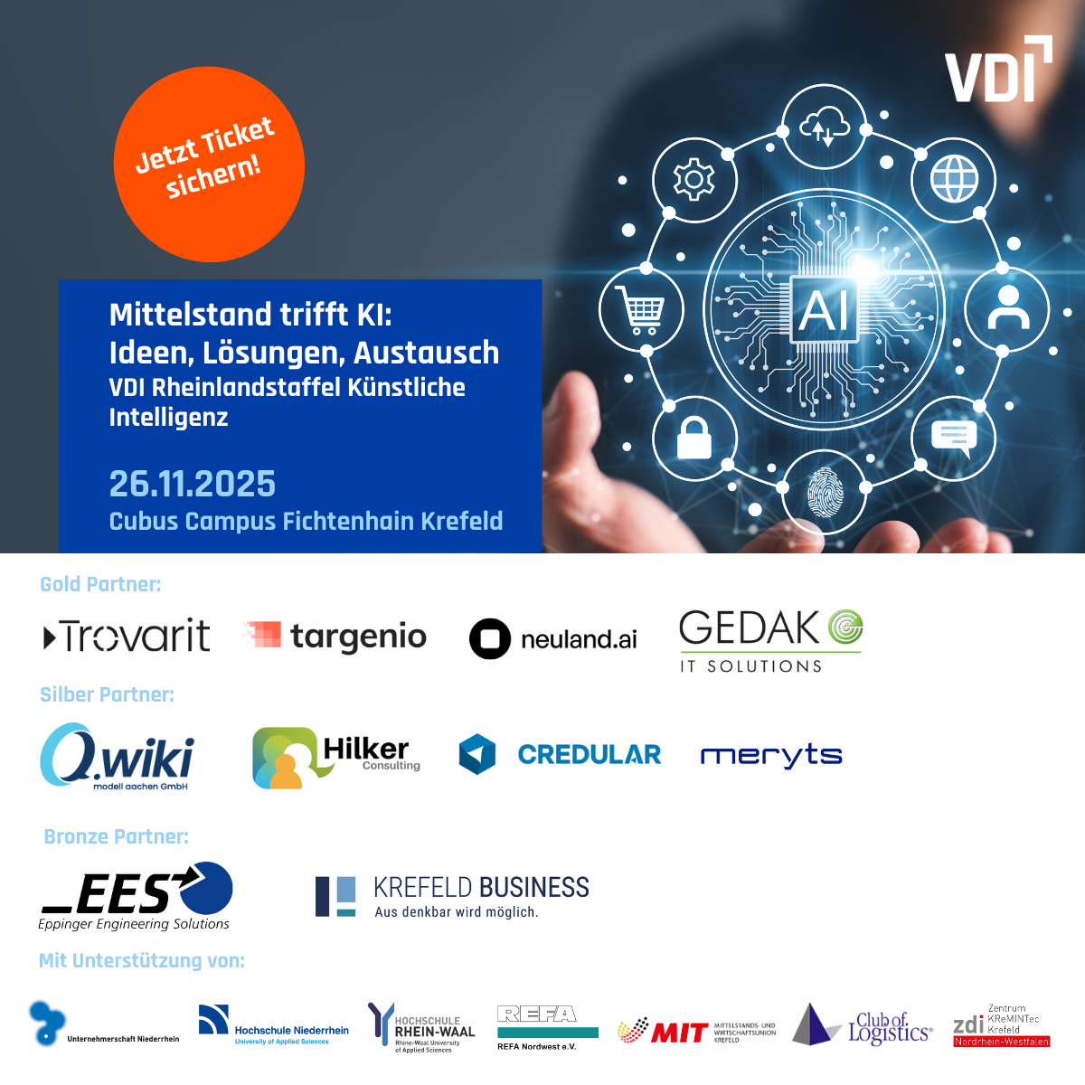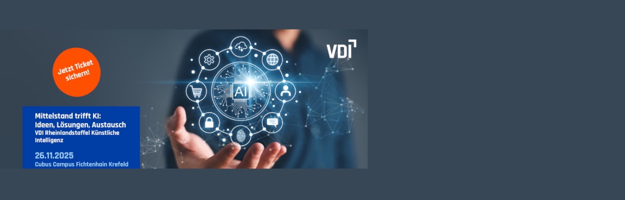 Erleben Sie KI in der Praxis – VDI Rheinlandstaffel Künstliche Intelligenz 2025 Am 26. November 2025 verwandelt sich der Cubus Campus in Krefeld Fichtenhain in den Treffpunkt für alle, die Künstliche Intelligenz konkret im Mittelstand einsetzen und gestalten wollen. Freuen Sie sich auf einen Tag voller Praxisbeispiele, Fachvorträge und Networking.