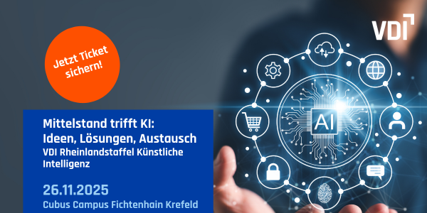 Erleben Sie KI in der Praxis – VDI Rheinlandstaffel Künstliche Intelligenz 2025 Am 26. November 2025 verwandelt sich der Cubus Campus in Krefeld Fichtenhain in den Treffpunkt für alle, die Künstliche Intelligenz konkret im Mittelstand einsetzen und gestalten wollen. Freuen Sie sich auf einen Tag voller Praxisbeispiele, Fachvorträge und Networking.