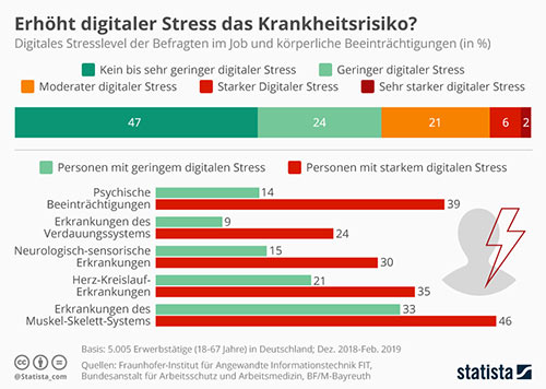 Im Rahmen einer Studie des Forschungs- und Entwicklungsprojektes „PräDiTec“ des Fraunhofer-Instituts, die Bundesanstalt für Arbeitsschutz und Arbeitsmedizin und des Betriebswirtschaftlichen Forschungszentrums für Fragen der Mittelständischen Wirtschaft wurden über 5.000 Erwerbstätige zum Stresslevel im digitalisierten Berufsleben befragt. Über die Hälfte, also 53 Prozent, erleben zumindest geringen digitalen Stress, davon leiden acht Prozent unter starkem bis sehr starkem. Dieser steigert das Krankheitsrisiko erheblich: Von psychischen Beeinträchtigungen sind unter den Beschäftigten mit geringem digitalen Stress 14 Prozent betroffen. Bei denen mit viel Stress sind es dagegen 39 Prozent. Dieser Trend setzt sich über alle abgefragten Krankheitsbilder fort.