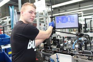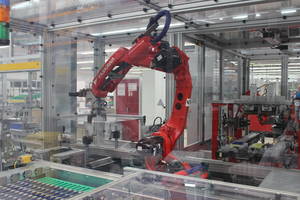Den ersten Schritt bei der Herstellung von Batterie-Modulen übernimmt ein Roboter. Innerhalb von Sekunden testet er die Funktion der einzelnen Batteriezellen und setzt sie anschließend ein. Bei Fehlern sortiert er die defekten Elemente aus. Die Endmontage der Batterien erfolgt teilautomatisiert auf der Fertigungsstraße.