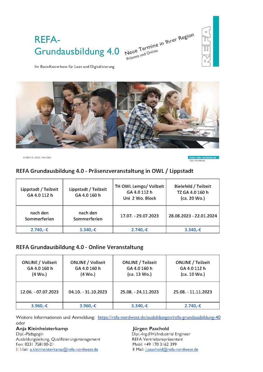 Hierbei unterstützt der REFA Nordwest e.V. mit seinen erprobten und fundierten Optimierungsmethoden und Werkzeugen. Das passende Know-how liefert REFA mit der REFA-Grundausbildung 4.0.